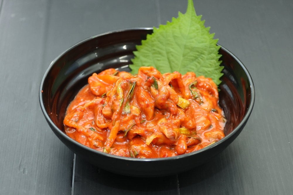 厳選したイカの塩辛にヤンニョムを入れて、バランスを取り、塩辛の旨味とヤンニョムの甘辛さが合わさった当店人気商品。